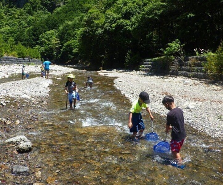 【内容】水辺などで自由遊びを行います。春はガサガサ生き物探し、夏はジャブジャブ川遊びをします。山☆川kids in大杉谷は午後からの半日プログラムです。