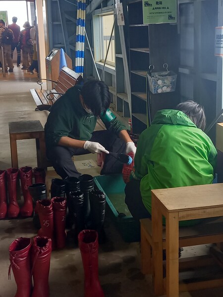 13:30カウンター業務、長靴の貸し出しやレクチャーを行う