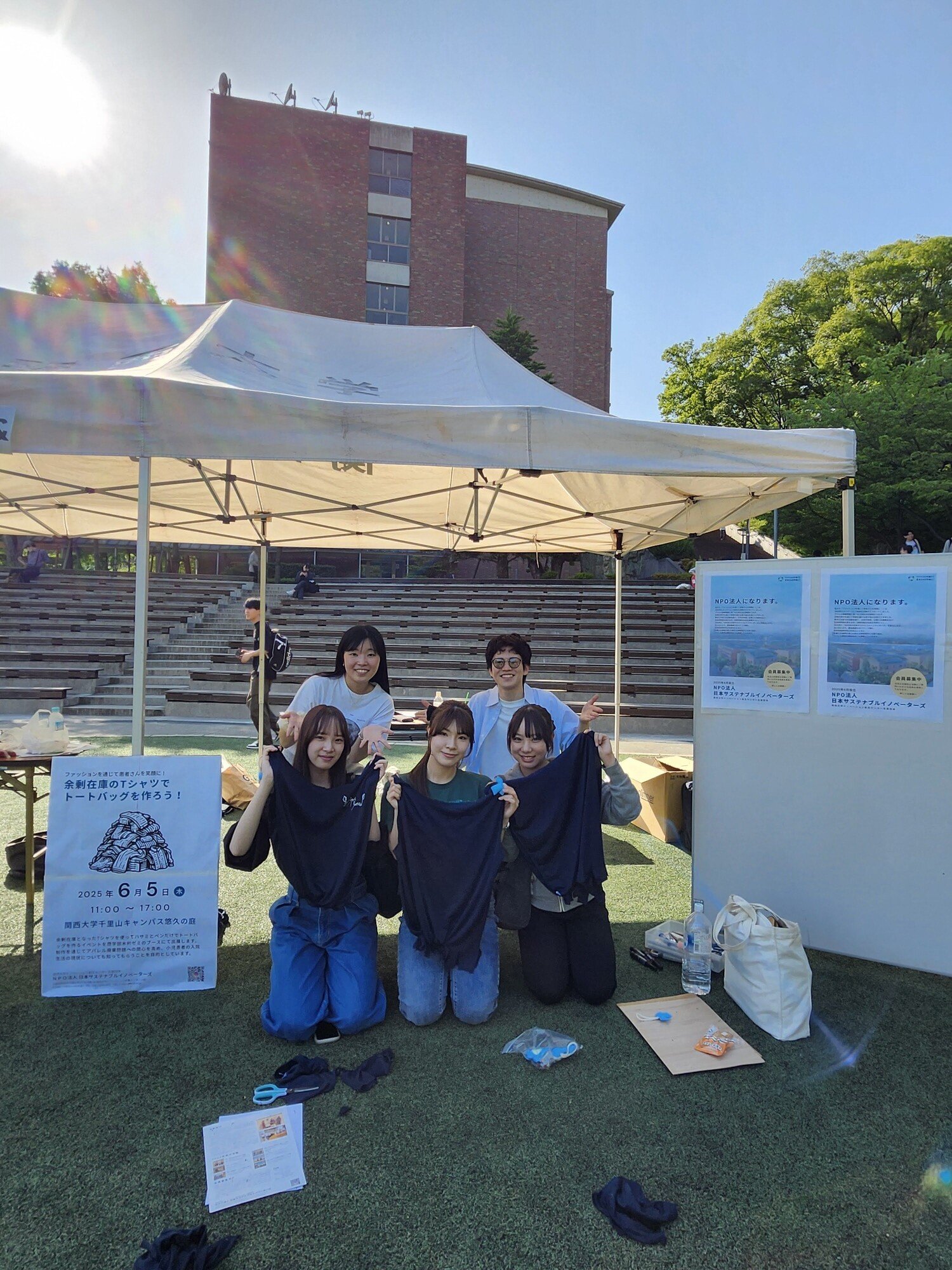 関西大学商学部深澤ゼミが関西大学悠久の庭にて主催した「考動」プロジェクトイベントに、商学部木村ゼミの協力のもと、余剰在庫のTシャツを用いてトートバックを作るワークショップブースを出展しました。