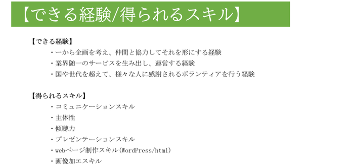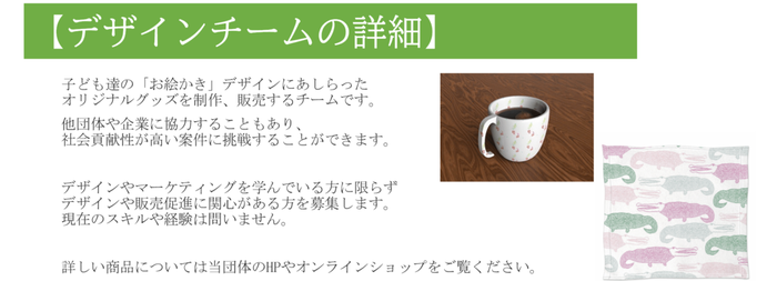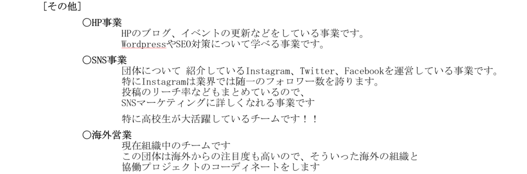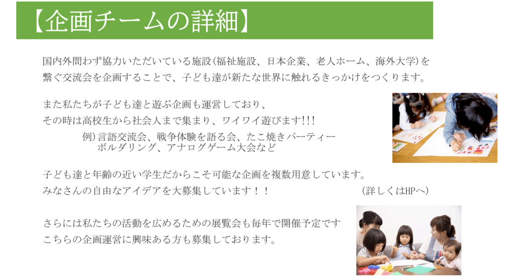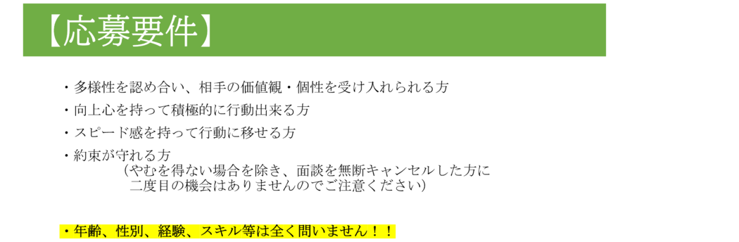 | 必要経費 | 無料 交通費は弊社の規定によって支給いたします。大学生のボランティアが多い団体です!大学生のうちから企画や団体・会社運営に携わってみたい方募集です! |