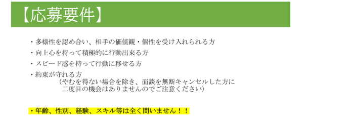| 募集対象 | 私たちの活動を「オモシロイ」と思ってくれる方、やりがいを感じる方 一緒に活動する人の年齢層について