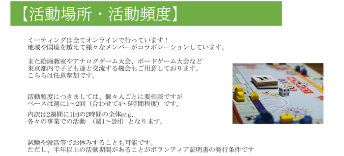 | 活動場所 | MTGはオンラインと対面のハイブリット |
