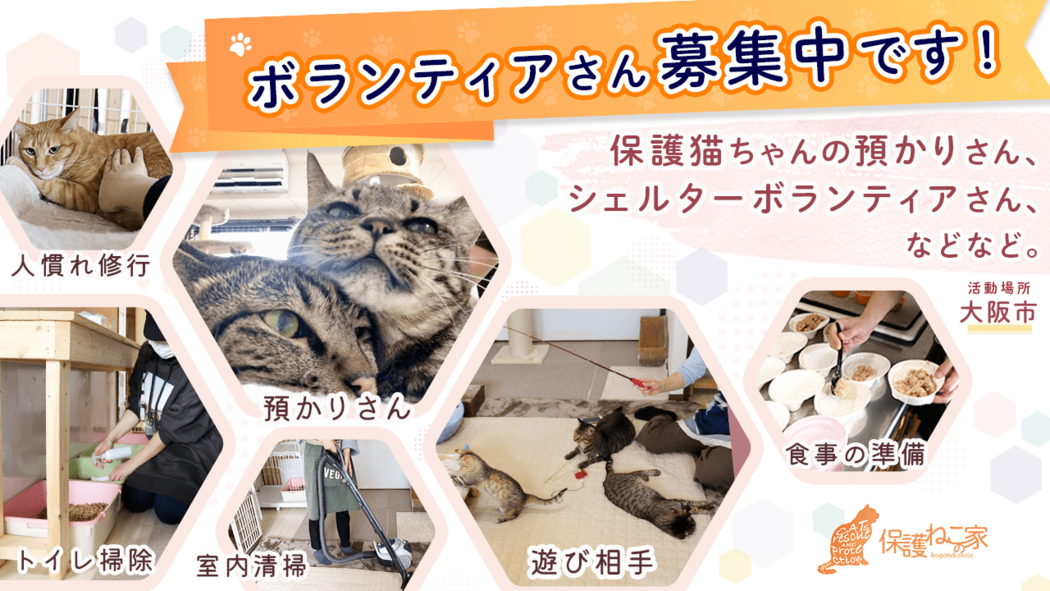 大阪市で活動する「保護ねこの家」では、共に活動していただけるボランティアさんを随時募集しています。