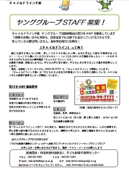 - チャイルドライン千葉「ヤンググループ」は若者の、電話の受け手ボランティアを募集中