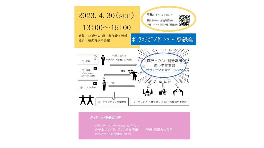 を開催します。どんなボランティア紹介実績があるのか、登録の仕方、ボランティア証明の発行の仕方などご紹介する『青少年ボランティアステーションガイダンス・登録会』を開催しますので参加待ちしています。要申込(藤沢市みらい創造財団HPから直接申し込むことができます)