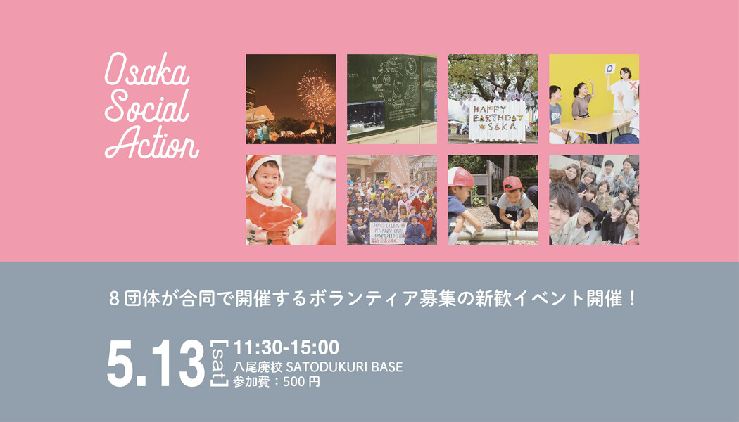 NPOや市民団体などボランティアを募集している団体と大学生のマッチングイベント。 「なにかをはじめたい」 大学生たちは、そんな思いで新しいバイトやサークルなどを始めます。 その選択肢のひとつにボラティアもあるのでは? ということで、ソーシャルな活動をしている複数の団体が集まる新歓イベントを開催しています。 八尾市会場では、アウトドアな空間の中、みんなでアウトドアクッキングをしながら交流を深めます。 大阪市会場では、説明会のような雰囲気で、じっくりと団体の話を聞くことができます。 毎年、100名近くの大学生が集まり、新しいボランティアとの出会いが生まれます。
