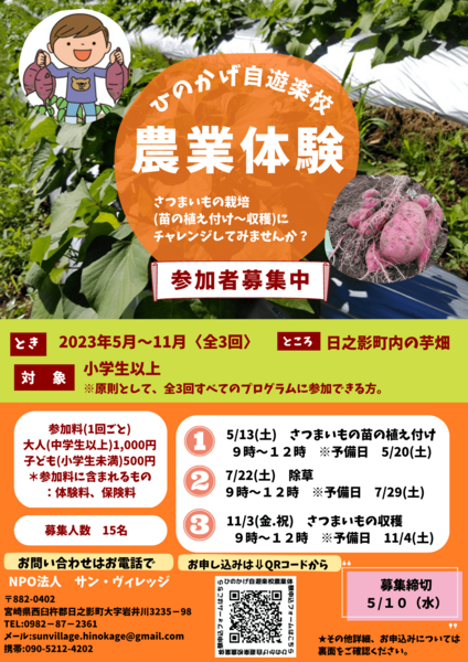 ひのかげ自遊楽校は主体性や、生きる力を育む子どもの居場所。をベースとしたコミュニティづくりをスタートしました。その一貫として農業体験(芋づくり)を年3回開催します。