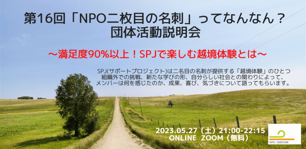 "2枚目の名刺"は、所属する組織、立場を超え、社会のこれからを創る時に持つ名刺です。社会貢献活動に留まらず、これまでなかった組織外での挑戦、新たな学びの形や自分らしい社会との関わりなどを生み出すサポートプロジェクト(以下SPJ)。社会人が従来の人生モデルから一歩踏み出す役割を果たす"2枚目の名刺"の機会を多くの人に届けていくことに挑戦しています。この説明会では、「二枚目の名刺」のミッション・ビジョン、活動内容、SPJに参加した社会人や弊団体の運営メンバーの方からのリアルな声をお届けします。
