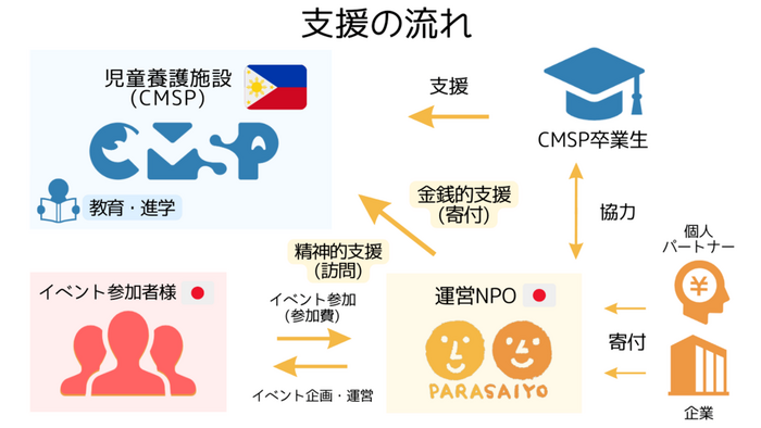 主催団体PARSAIYOは様々なチャリティーイベントを企画しており、各イベントの参加費の一部が、チャリティとしてPARASAIYOの支援するフィリピンの児童養護施設CMSPの学費及び支援活動費になります。PARASAIYOのメンバーは年に1回支援先の児童養護施設を訪問しており、子供達に教育プログラムを提供したり、一緒に遊びながら交流もしています。もし何か質問等ございましたら、お気軽にご連絡くださいませ!