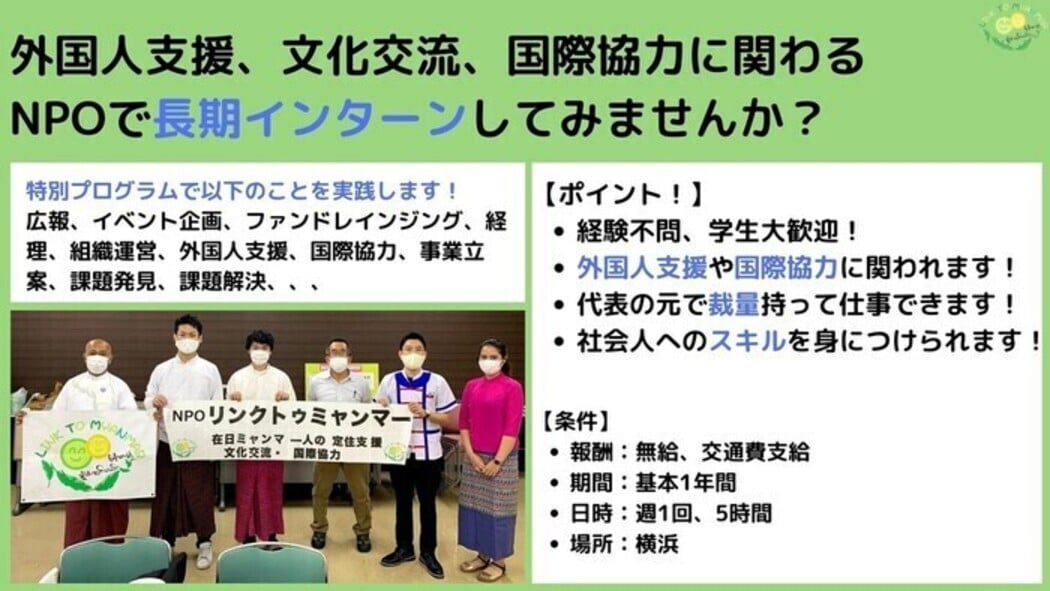 この募集の受入法人「特定非営利活動法人リンクトゥミャンマー」をフォローして、