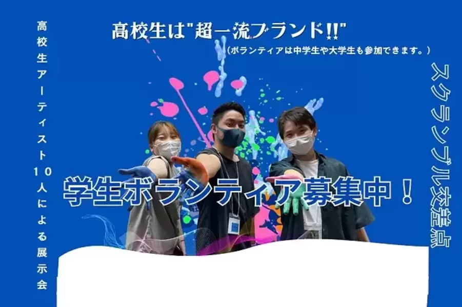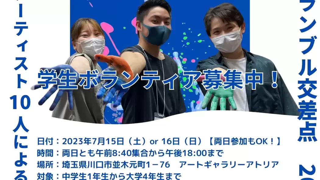 「高校生が自分を表現できる場を作る」ことをテーマに全国から集まった高校生アーティスト10名の作品を飾った「小さな未来の美術館」のような「スクランブル交差展」という展示会を開催します。この作品展で、ボランティアを行っていただく方にお願いするのは、作品の紹介、お客さんの集客、アート体験ができるワークショップ、アンケートの収集などを行って頂きます!役割については後日相談して決定致します。アートに興味のある学生はもちろん、今回のこのイベントは川口市やギャラリー周辺のお店にも協力頂いているので地域連携に興味のある学生にもオススメです!また、参加証明書も発行しているので、受験や就職に使いたい方も歓迎です!学生の力で「小さな美術館」を作ってみせましょう!!!