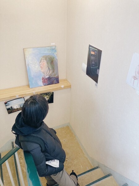 私は、午前中を担当しました。会場に30分前に着き、最終準備を行い、オープンしました。道を通る人のほとんどが、作品を見てくれますが、なかなか、会場内に入る人は少なかったです。もっと、会場前でチラシを配れば良かったと思いました。また、もう少し入りやすくしたいと思いました。
