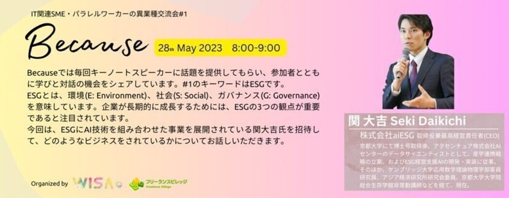 今回は、ESGにAI技術を組み合わせた事業を展開されている関大吉氏を招待して、どのようなビジネスをされているかについてお話しいただきます。