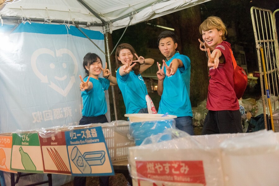 エコステーションでの分別回収の徹底、リユース食器の露店への導入、会場内での拾い歩きを通して、ごみのない天神祭を目指します。