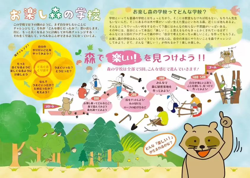 このプログラムでは子どもたちが「自分の考えた"楽しいこと"森の中に実現する」という全体のテーマに基づき、全5回を以下の流れで進行します。