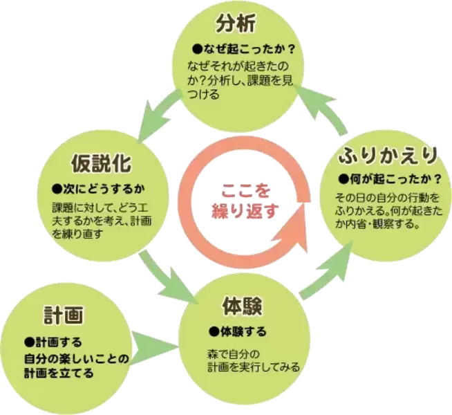 体験学習法の循環学習プロセス (計画→体験→ふりかえり→分析 仮説化) に沿って 「自分たちの目標達成の計画を立て、計画を実行し、 実行したことをふりかえり、 その内容を分析し、次にどうするか考え、 再度実行する」 というプロセスを繰り返すことで、効果的 に学びが深まります。