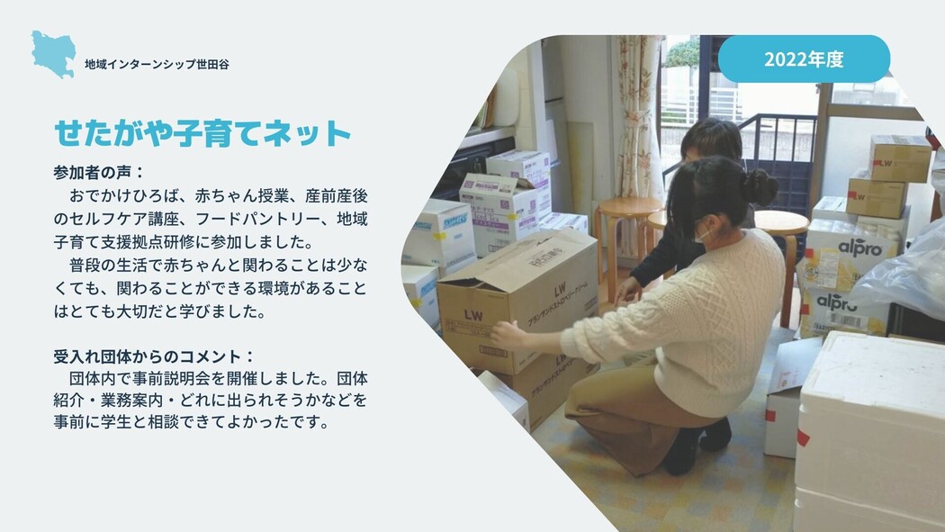 夏やイベントや祭りでの出展ブースを担当する、ふれあい赤ちゃん体験授業、産前・産後セルフケア講座、区民版子ども・子育て会議、おでかけひろば、小学生低学年対象の放課後の学び場、フードパントリー、寺町での高齢者の居場所づくりのサポ―ト、「せたがや子育てライフ」のHPへのアイデアや作業などができます。