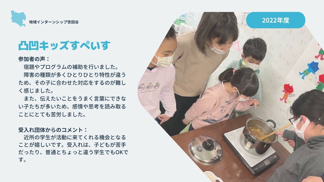 世田谷で街なか留学しませんか?子育て支援、障害者支援、環境教育、お祭りや場づくりなどなど、10活動団体から【選べるインターン】です。学生同士の交流も充実。最後はインターン先をみんなに紹介する会も。