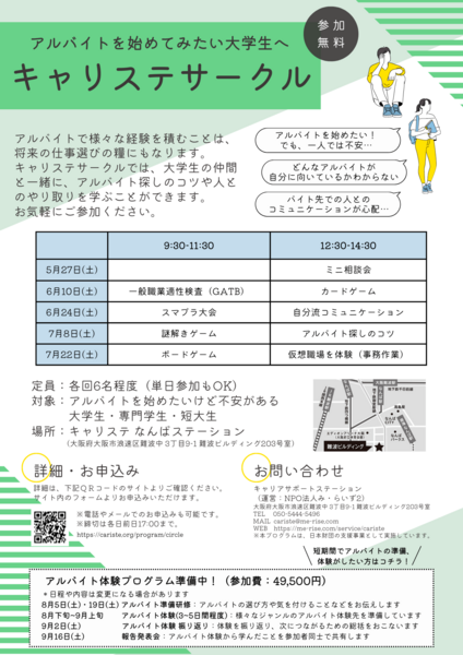 キャリステサークルでは、アルバイト探しのコツや、大学生の仲間と一緒に人とのやり取りを学ぶことができます。