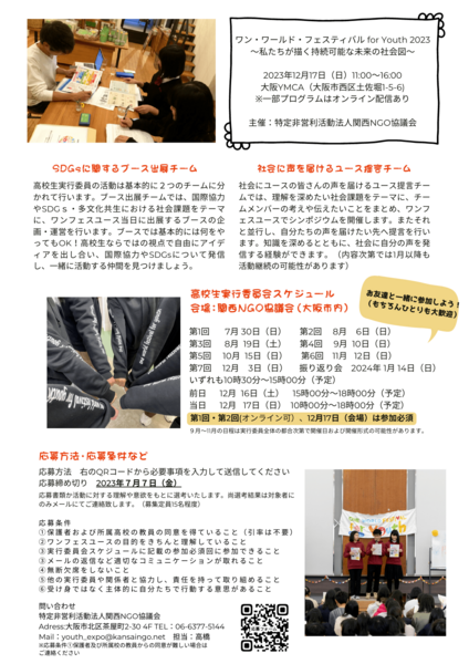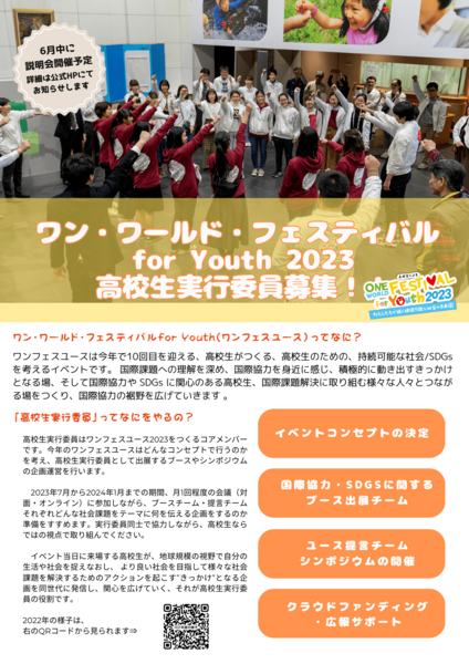 高校生による、高校生のための国際協力・SDGs・多文化共生のイベント「ワン・ワールド・フェスティバル for Youth 2023」を一緒につくる高校生実行委員を募集しています