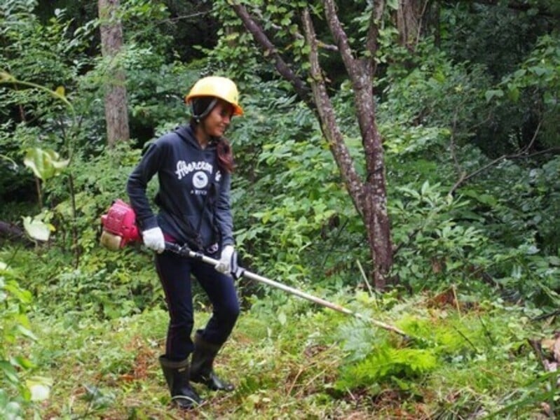①ふるさとの森公園で刈払機を使って下草刈り等の管理作業