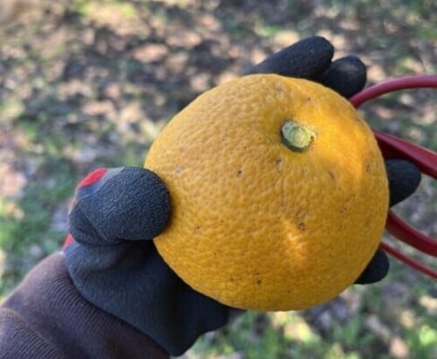 八朔を収穫するとき、「二度切り」と言って八朔の「軸」の長い部分を切り落とす方法で行います。軸を長いまま残していると、その軸で他の八朔を傷つけ、その部分から傷むことを防ぐためです。