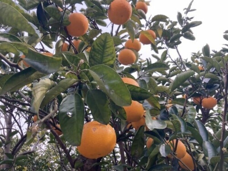 木の上の方に生っている八朔は太陽光を一番に受けているため、片手で持てないくらい大きくずっしり