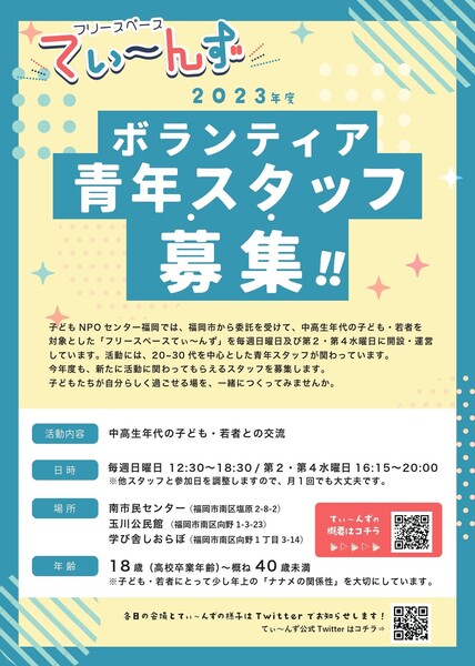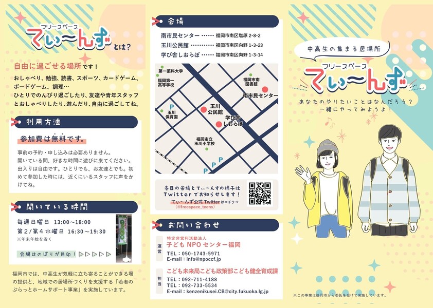 子どもNPOセンター福岡では、福岡市から委託を受けて、中高生年代の子ども・若者を対象とした「フリースペースてぃ~んず」を毎週日曜日及び第2・第4水曜日に開設・運営しています。
