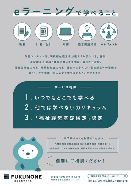 業界初となる、保育・介護・障がい福祉等の福祉経営を学ぶeラーニングを運営しております。講義・ドリルの修了は「福祉経営基礎検定」の認定資格にもなっています。2040年には96万人の人手不足になると言われている医療・福祉業界。福祉の経営における知識や機会を提供し、地域の福祉施設の人財育成をサポートすることで、福祉業界の継続・発展に貢献したいと考えており、より多くの方に本サービスについて知って頂きたく、ご協力をお願いいたします。