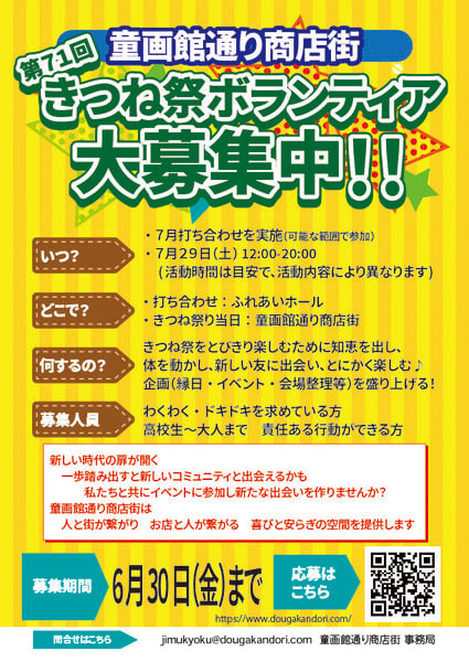 岡谷市童画館通り商店街では、岡谷きつね祭を一緒に盛り上げてくれるボランティアを募集しています。