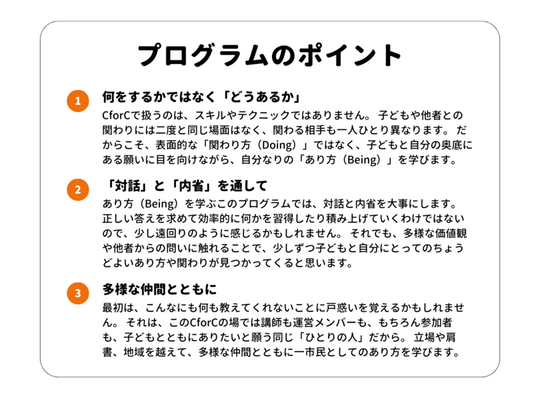 だからこそ、「子どもとともに」を大切に、子どものことも自分のこともみつめ、大切にする。 CforCを通じて、そんな文化を少しずつ、みんなで広げていきたいと願っています。
