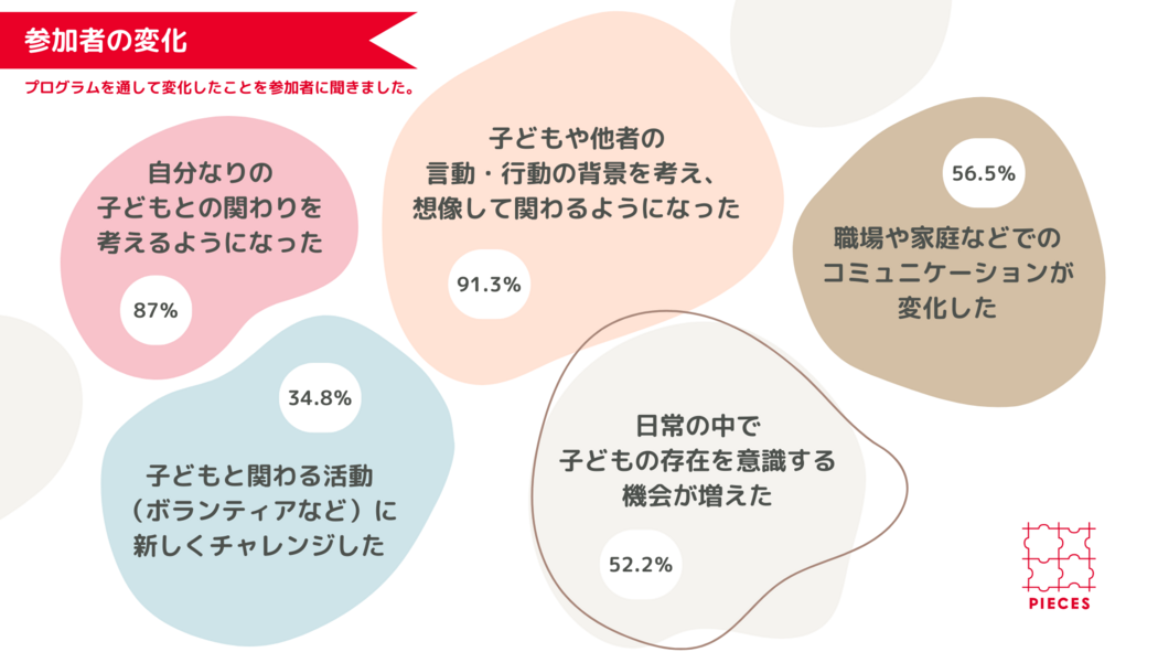 ・知識だけでなく、自分で自分の正解や大切にしたいもの、自分にしかないものを全国の仲間と一緒に見つめられる。子どもとの関わりだけでなく、それぞれの人生をとても豊かにするものだと思った。(18-24歳、学生)
