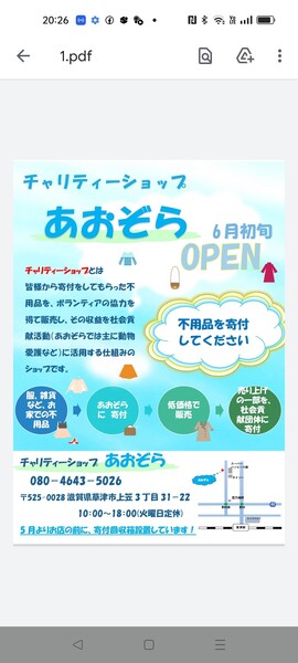 チャリティーショップとは、皆様から不用品を寄付していただき、ボランティアの協力を得て安価で販売し、売上の一部を社会貢献団体(あおぞらでは主に動物愛護など)に寄付するしくみのショップです。