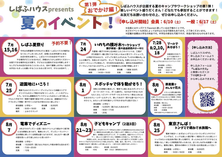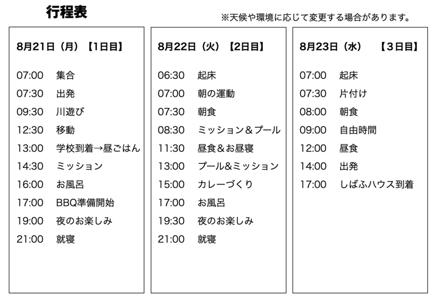 8月21日の朝、さいたま市(北与野駅・さいたま新都心駅)にあるしばふハウス(現在移転準備中のため出発地は北与野駅周辺)を出発して、群馬県みなかみにある泊まれる学校『さる小』に、大型バスで移動します。8月23日の夕方17時ごろにまたしばふハウスに戻ります。 |