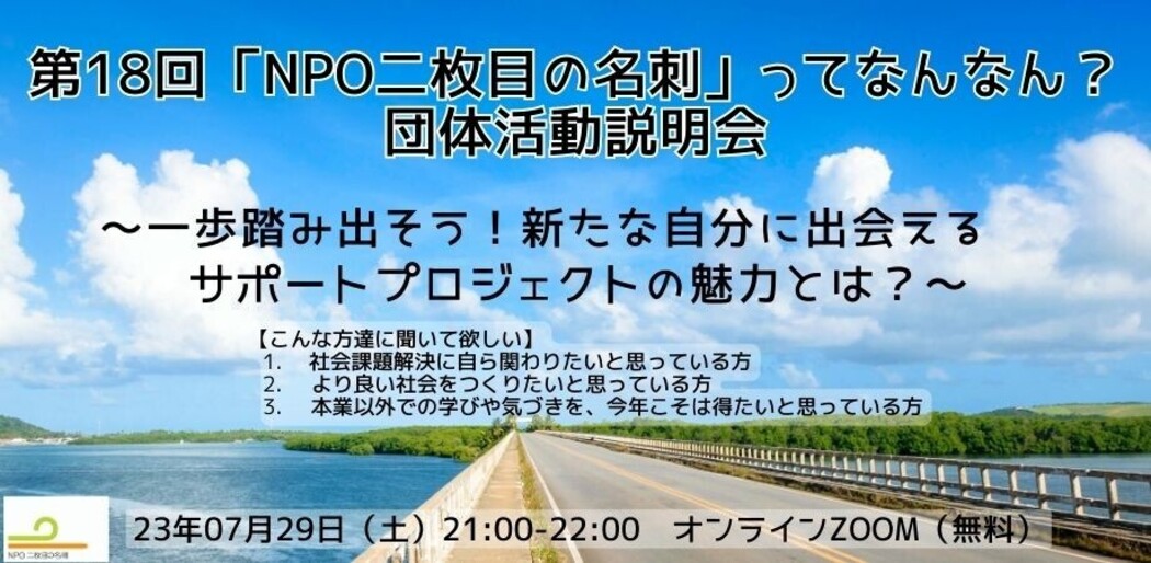 "2枚目の名刺"は、所属する組織、立場を超え、社会のこれからを創る時に持つ名刺です。社会貢献活動に留まらず、これまでなかった組織外での挑戦、新たな学びの形や自分らしい社会との関わりなどを生み出すサポートプロジェクト(以下SPJ)。社会人が従来の人生モデルから一歩踏み出す役割を果たす"2枚目の名刺"の機会を多くの人に届けていくことに挑戦しています。この説明会では、「二枚目の名刺」のミッション・ビジョン、活動内容、SPJに参加した社会人や弊団体の運営メンバーの方からのリアルな声をお届けします。