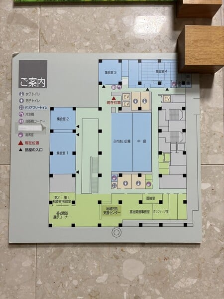 入口を入ったら正面のエレベーターで2階上がってください。受付は3集会室で行います。 |