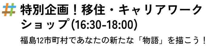 | 7. タイムライン | 14:00-14:10 ご挨拶・趣旨説明 14:10-14:45 ゲストによる活動紹介 14:45-15:10 パネルディスカッション 15:10-15:25 各種支援制度や福島12市町村のイベント等のご案内 15:25-15:35 休憩 15:35-16:05 座談会・個別相談会 16:05-16:10 終わりのご挨拶 ※16:10~ 個別相談会・ツアーの申込を受付けます ※16:30から特別企画!福島12市町村であなたの新たな「物語」を描こう!移住・キャリアワークショップを開催します |