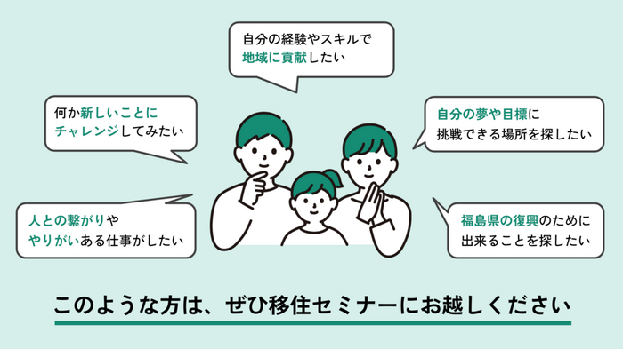 この移住セミナーは「何か新しいことにチャレンジしてみたい」「自分の経験やスキルで地域に貢献したい」「福島県の復興のために出来ることを探したい」などの思いを持った、あなたに向けたセミナーです。