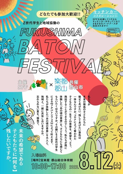 フクバトンフェスという名前は、学生や地域の夢と希望を、次の世代へと「タスキ・バトン」を繋いでいくイメージから名づけられました。