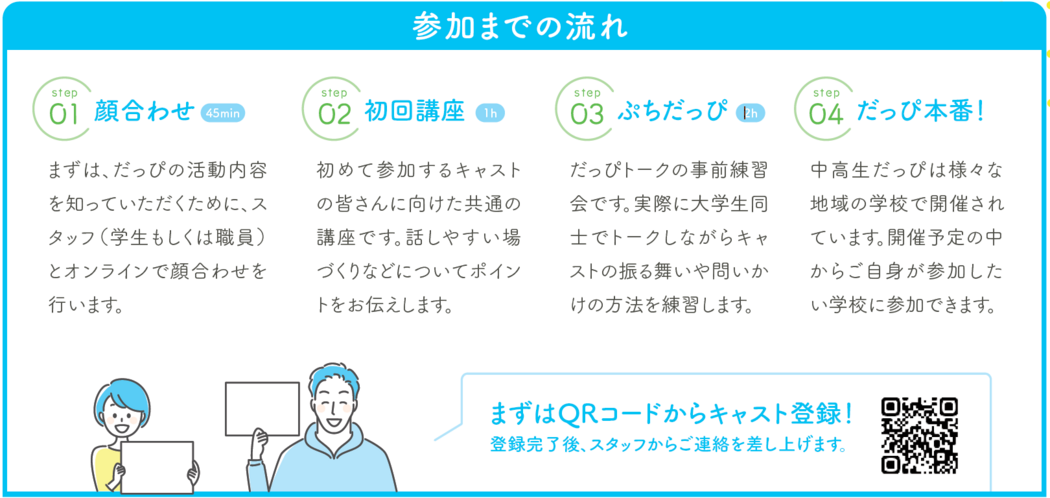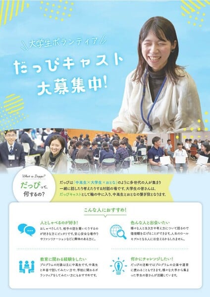 そこで大学生の皆さんは、だっぴキャストとして輪の中に入り、中高生とおとなの繋ぎ役となります。