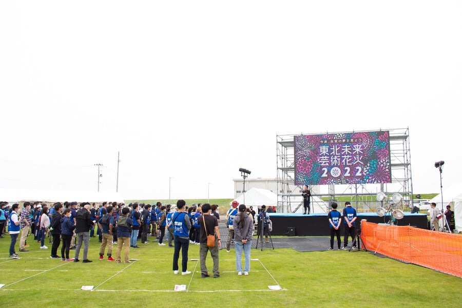 昨年 6 月 11 日(土)東北の明るい未来を願い、復興から発展を目指した市⺠参加型の持続可能な地域創生イベントとして「東北未来芸術花火」は初開催されました。宮城県亘理町、人口約 3 万人の小さな町、約 1 万 2 千以上の観客が集い、約 190 名のボランティア・50 社の協賛企業に支えられ打上げられた「花火」そのほとんどは分厚い雲に飲み込まれ、悔しさだけが 地上に降り積もっていきました。ただ、私たちが見上げた夜空の向こう側、雲の上では色とりどりの花火が瞬いていました。