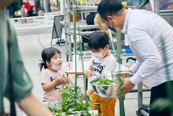 渋谷にある共創施設100NBANCHと協同で、渋谷川沿いにシブヤ系循環型農園「100BANCH farm」を設置しました。5月にタネを撒いて、それぞれの家庭で苗に育てていただき、6月に農園を設置してから苗を植え替え、7月に収穫祭を実施しました。