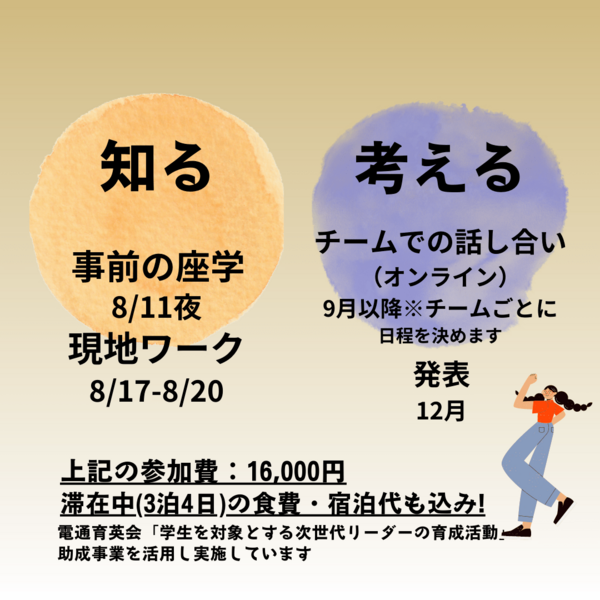 活動経費の内訳には、現地活動4日間の宿泊費、交通費、食費などが含まれます。 |