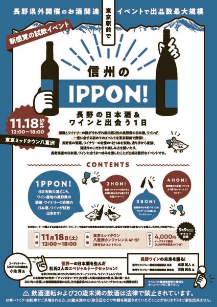 長野県の日本酒・ワインの認知および販路拡大を目的に開催する試飲イベント「信州のIPPON!」のボランティアを募集します。長野のお酒を盛り上げていただくと同時に長野県のお酒を知っていただければと思います