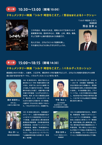 「絹に願いを!」では、一部でドキュメンタリー映画上映会、二部では絹産業とゆかりの深い、3市の連携についてのパネルディスカッションを行います。