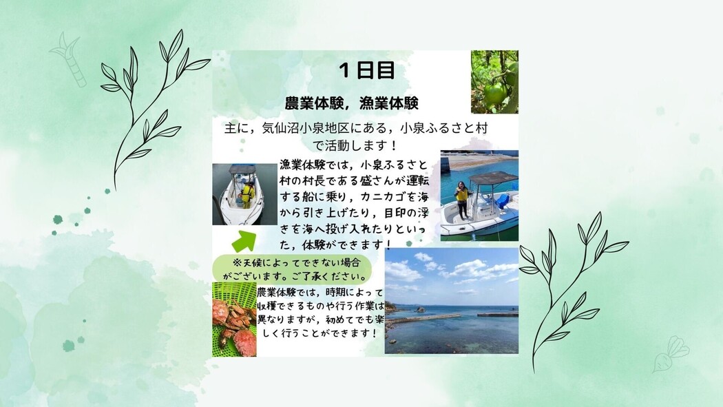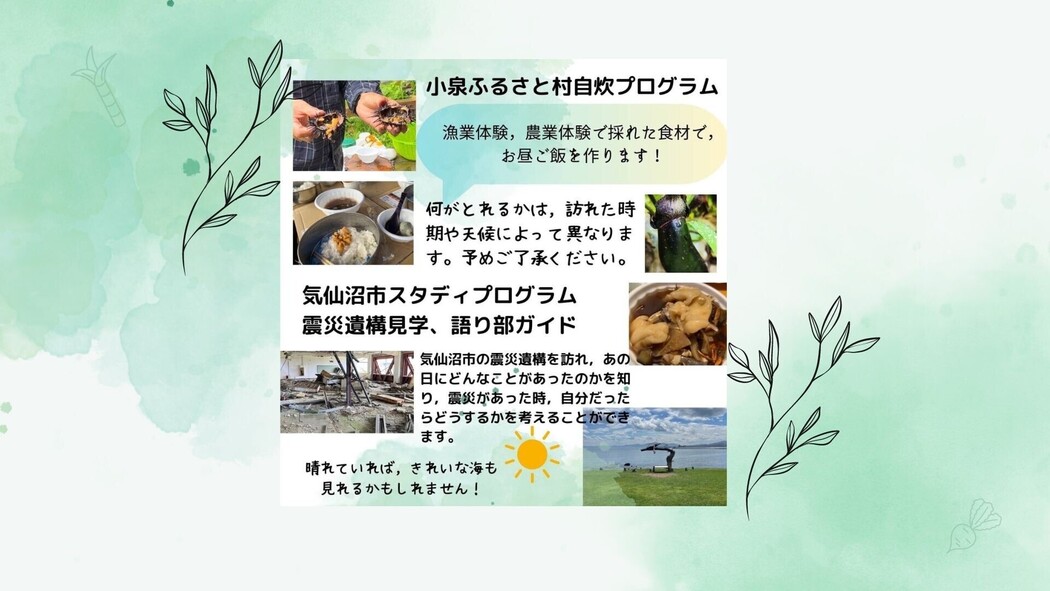 内容:農業体験、漁業体験 (乗船はしませんが、魚介をとる作業を行います)、東日本大震災スタディプログラム