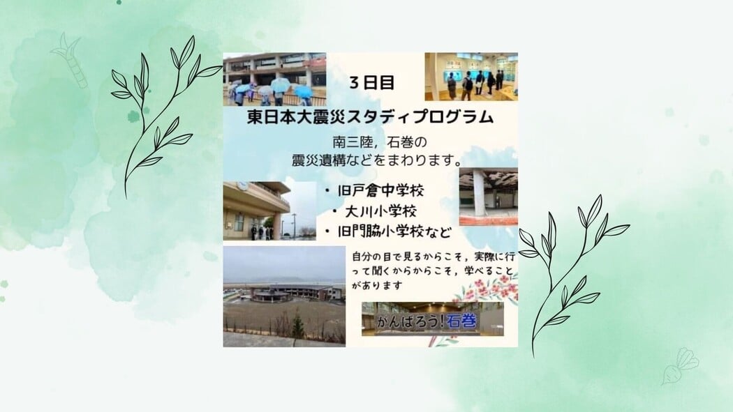 内容:東日本大震災スタディプログラム。南三陸、石巻の震災遺構などをまわります。