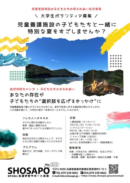 - 【大学生募集 姫路市】児童養護施設の小中学生の子どもたちと自然体験キャンプ”!