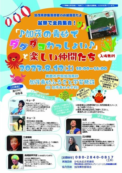 加茂青砂集落賛歌「♪加茂の青砂でダダダコわっしょい♪」のお披露目を兼ねた集落の盆祭スタッフを募集しています。男鹿半島の小さな集落を盛り上げます。会場設営・駐車場誘導のお手伝いをお願いします!