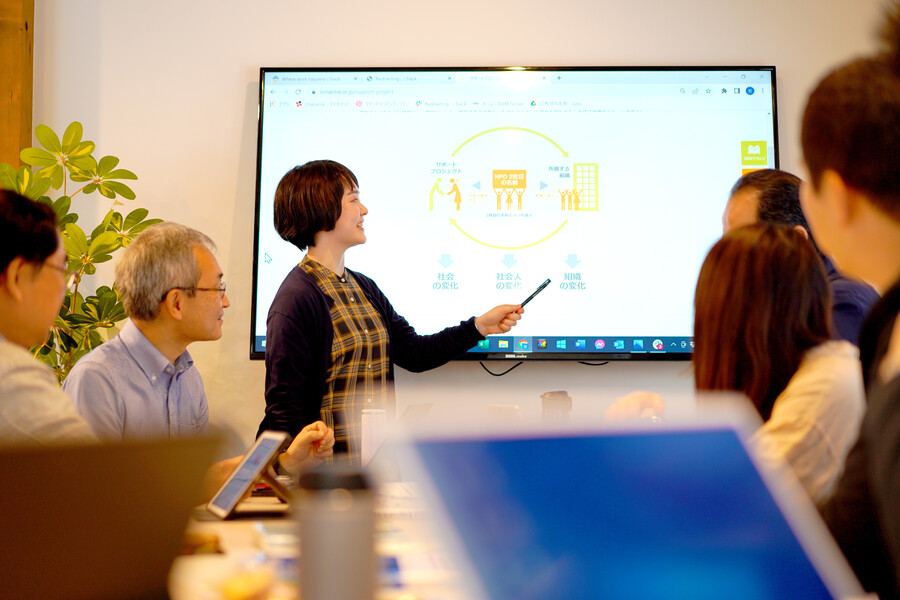 サポートプロジェクトは、さまざまな業種・職種の社会人がチームを組み、新しい社会を創ることを目指す団体(NPOなど)とともに、団体の事業推進に取り組む有期のプロジェクトです。通常、5人程度の社会人チームが3~4か月の期間で行います。プロジェクトテーマは、パートナー団体と社会人チームで協議し、柔軟に設定して実施します。NPO法人二枚目の名刺は、プロジェクトチームのチームビルディングや、社会人チームとパートナー団体のコミュニケーションのサポートなどプロジェクト全体の推進をサポートします。カズ
